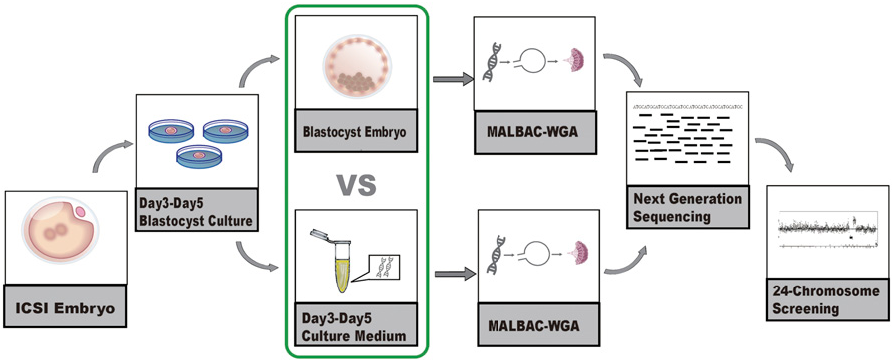 Phương pháp nghiên cứu: Nhóm nghiên cứu đã thực hiện một số điều chỉnh quan trọng cho thành phần BCM thu nhận (trộn lẫn dịch khoang phôi và môi trường đã dùng nuôi phôi nang với nhau) cũng như các kỹ thuật khuếch đại dựa trên vòng lặp ủ và lặp nhiều lần (MALBAC) và các quy trình tạo thư viện. Thiết kế của một mồi tiền khuếch đại (Pre-AMP) và các mồi AMP 1 và 2 cho phép chuẩn bị một thư viện giải trình tự thế hệ mới sau giai đoạn khuếch đại theo cấp số nhân bằng cách đưa các mồi của Illumina P5 và P7 vào các sản phẩm cuối mà sau đó đã sẵn sàng để giải trình tự. Trình tự được thực hiện trên nền tảng Illumina Hiseq 2500 với số lần đọc thô 2.0 Mb được tạo cho mỗi mẫu.